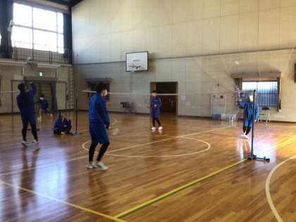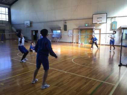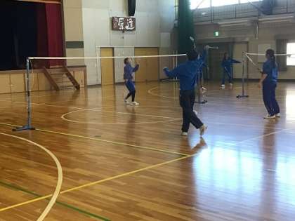 2年生の保健体育科です。体育館でバドミントンに挑戦です。制限時間の中でポイントを競い合いながら試合をしていました。