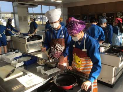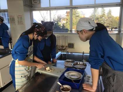 3年生の家庭科です。幼児のおやつとして「スティック大学芋」を作っています。食べやすさなど、小さな子の立場に立って調理をしました。