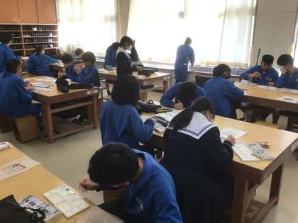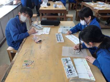 3年生の美術科です。卒業制作でオルゴールを作っています。絵画などで線ではなく点の集合や非常に短いタッチで表現する技法である点描法を使って、デザインをしています。集中力がいる作業ですね。