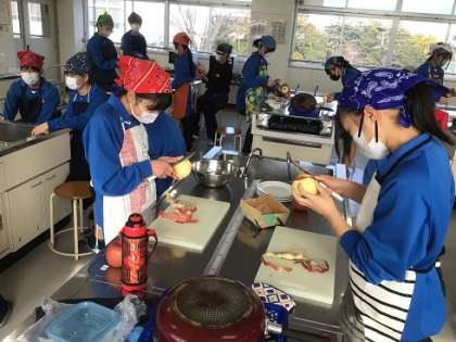 2年生の家庭科です。リンゴの皮むきをしました。普段なかなか経験していない人が多いと思いますが、みんな集中して取り組んでいました。