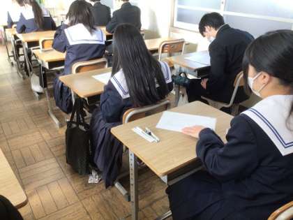 今日は1・2年生の学習診断テストです。1日に5教科のテストをします(高校の入試の多くが同じような日程となります)。集中力を保ちながら、持てる力を出し切ってほしいと願っています。写真は、テスト開始直前の2年生です。