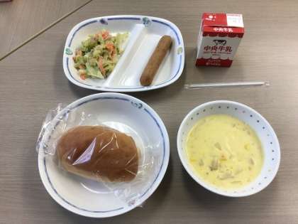 全国学校給食週間5日目の献立です。今日はコーンチャウダー、ツナサラダ、ウインナー、米粉パンが出ました。