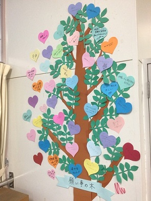 学校図書館にある掲示物です。自分の願い事を葉っぱに見立てたカードに書いて、貼っていくようになっています。図書館の入口に、カードや説明の書かれた箱が置いてありますので、図書館に行ったときはぜひ確認してみてください。
