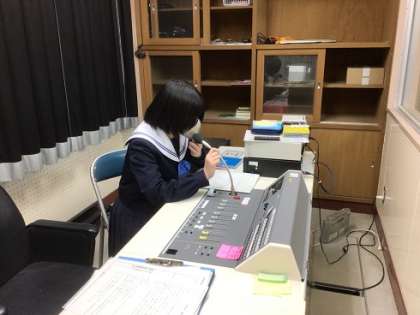 給食の放送で、校長が翌日の目標を発表し、各学級で取り組みます。目標はカレーライスを作る色々な食材に例えられており、食材が意味する目標を代議員が発表します(写真)。1日に一つの食材(目標)をゲットすることで、カレーライスが出来上がります。