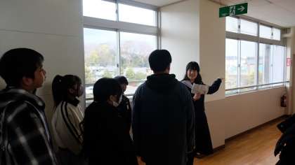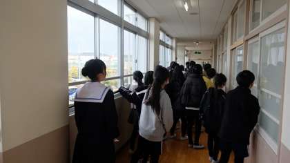 校内を見学している様子です。1年生の代表生徒が校舎内を案内しました。
