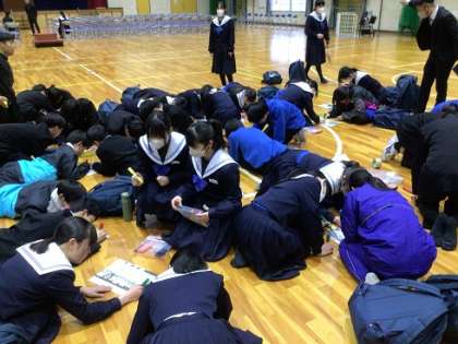 卒業生を送る会で披露したモザイクアートですが、一部修正が必要になりました。急な取組になりましたが、早朝から作業を進めてくれる1・2年生がたくさんいました。卒業式では、修正したモザイクアートを3年生や3年生保護者の方には見ていただけそうです。ありがとう!