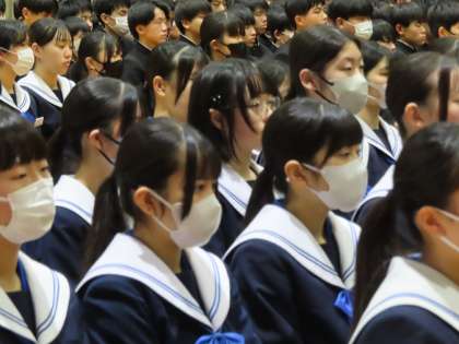 逢妻中学校では、卒業式の予行演習を「校内卒業式」と位置付けています。生徒の大変多い学校ですので、卒業式など保護者の方々をお招きする行事では、全学年が体育館に入ることができません。