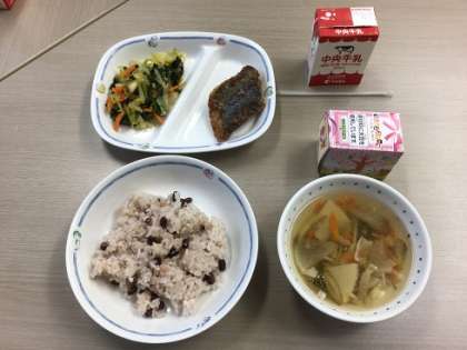 3月5日(水)卒業祝い献立 公開日 2025/03/06 更新日 2025/03/06 お知らせ 3年生の卒業を祝って、実施されました。赤飯、沢煮わん、なばなのおひたし、さわらのから揚げ、米粉のケーキ(いちご豆乳クリーム)が出ました。