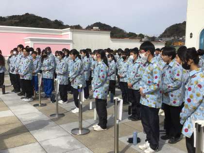 午前に職業体験をする子たちです。事前学習で学んだ立ち姿とあいさつの復習をしました。