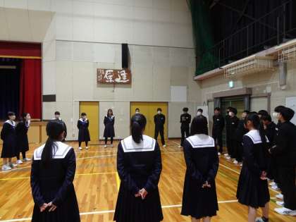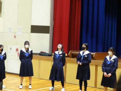 3年生進級を控えた2年生が立志式を行いました。第1部は、全員が体育館に集まっての「立志の誓い」です。学級ごとに輪になって、個人の誓いを立てたあと、群読をしました。