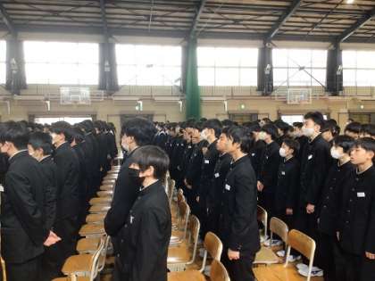 今日は令和6年度最後の登校日です。写真は修了式の様子です。表彰のあと、後期生徒会役員退任のあいさつ、来年度前期生徒会役員就任のあいさつがありました。