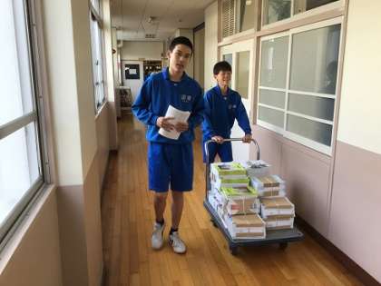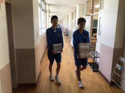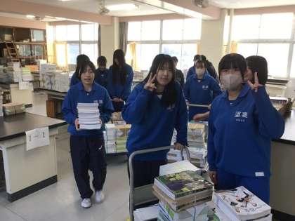 新しい教科書を各教室に配っています。量がたくさんあるので、かなり大変な作業でした。