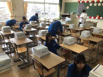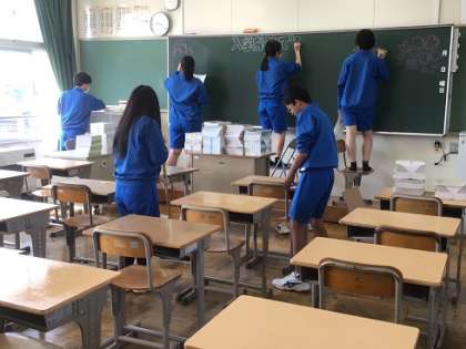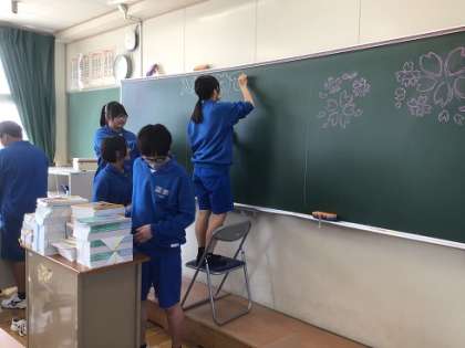 1年生の教室の清掃や黒板の飾りつけ、教科書の配付なども行いました。新入生がよいスタートを切ることができるようにと、熱心に取り組んでくれました。