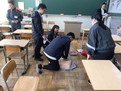 消防署の職員の方を講師にお招きし、緊急時シミュレーション研修を行いました。学校生活で急な事故等が起きた場合の対応や、救急搬送までの手順など、実際の場面を想定しながら取り組みました。