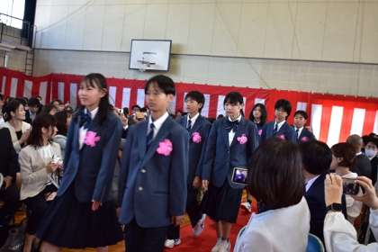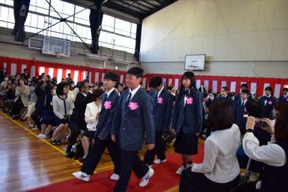 3年生のあたたかい拍手で迎えられ、新入生の入場です。みんな緊張?していますね。