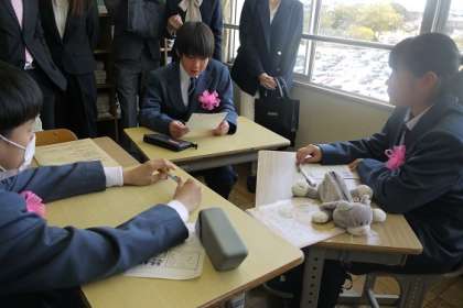 1年生の学級開きの様子です。先生の話を聞いたり、クラスで活動したりしながら、中学校でもがんばるぞという気持ちを高めました。