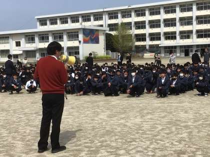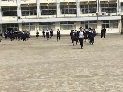 地震が発生し、校舎内で火災が起きたという想定で行いました。今年度初めての避難訓練なので、避難時の約束事や避難経路の確認が主なねらいです。
