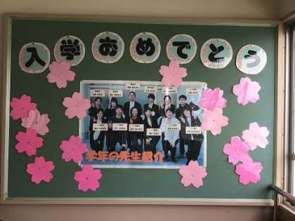 4月のスタート。学年ごとの掲示板では、先生紹介が掲載されています。写真は1年生です。