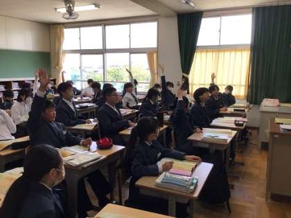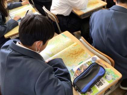 1年生の社会科です。地図帳を使って学習を進めていました。積極的に参加できていましたね。