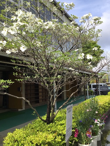 体育館横にあるハナミズキが、開花し始めました。令和7年度の逢中生の活躍を応援してくれています。
