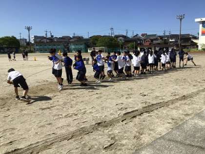 1年生の保健体育科です。大縄跳びの練習をしています。段々と跳べるようになってきましたね。これからも声をかけ合って、取り組んでいきましょう。