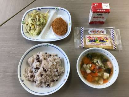今日の給食は、入学・進級をお祝いする献立でした。赤飯、えびカツ、ごぼうサラダ、花ふのすまし汁、ブルーベリークレープが出ました。