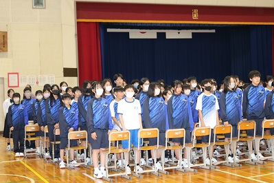 全校での校歌斉唱です。1年生の皆さんは、もう覚えることができましたか?