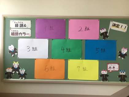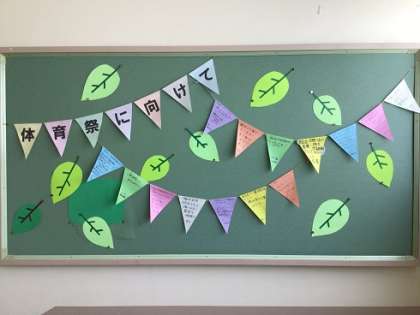 写真は、体育祭の組団カラーの紹介と各学級の決意表明が書かれた2年生の掲示板です。
