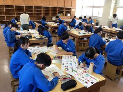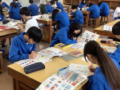 3年生の美術科です。配色ついて、実際に色を塗って確かめながら学習を進めていました。