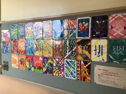 上は、昨年度1年生の作品「レタリング&マスキング」〜好きな漢字から感じるイメージ〜です。書体のデザインをもとに、美しくレタリングされています。下は、昨年度2年生の作品「図形を使った空間構成」です。透視図法や投影図を駆使し、配色を工夫しながら空間を表現しています。どちらも力作ぞろいです。