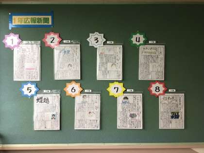 1年生の学年掲示板です。各学級の学級新聞第1号が掲載されています。どの学級もとても丁寧に書かれていて、読みやすく、学級の様子がよくわかる内容でした。