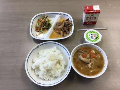 今日の給食は、豊田ブランドの日です。豊田ブランドの日とは、豊田市でとれた食材を使用した献立の日です。ごはん、みそ汁、アーモンドあえ、とよたひまわりポークのしょうが炒め、抹茶水ようかんが出ました。
