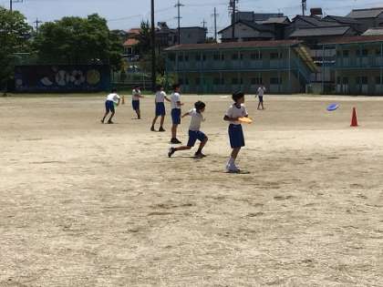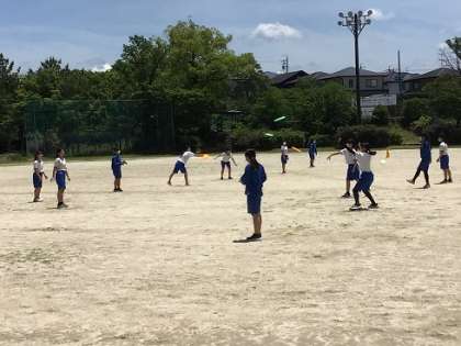 2年生の保健体育科です。アルティメットに挑戦です。アルティメットとは、フライングディスクをパスしながら運ぶ競技です。ディスクを投げたり、キャッチしたりしながら練習をしていました。