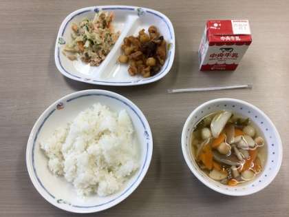 今日の献立にある「レバーとじゃがいもの甘辛煮」が、今回の「たべまる給食」です。あと、ふだま汁、和風サラダ、ごはんが出ました。