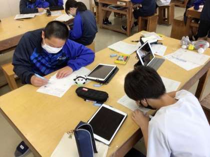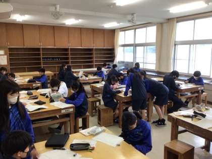 1年生の美術科です。連続模様を使ったアートバッグを制作しています。まずは模様のアイデアを考え中です。集中して取り組んでいましたね。