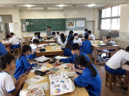 3年生の美術科です。今の自分を見つめて自画像を描いていくのですが、そのために配色や構成について学習しています。