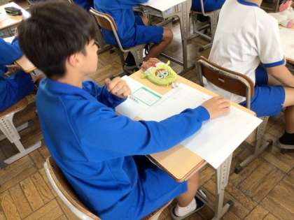 2年生の総合的な学習の時間です。自分の価値観を知るために、いろいろな質問に対する自分の考えを自問自答しています。