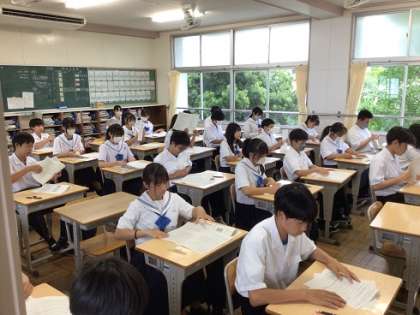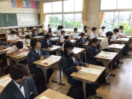 今回のテストでは、国語、社会、数学、理科、英語の5教科を受験しました。写真は5教科目のテストに臨む1年生(上)と2年生(下)です。もうひと頑張りですね。