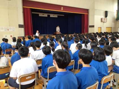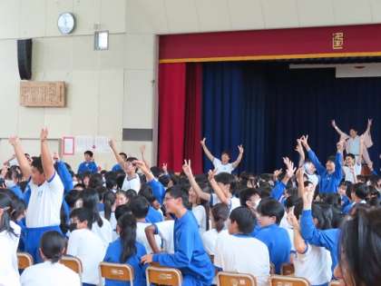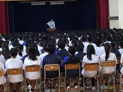 6月12日(木)育友会教育対話会 公開日 2025/06/12 更新日 2025/06/12 PTA活動 落語家の立川平林(たてかわ ひらりん)さんをお招きし、ネットリテラシーについての創作落語を全校で聞きました。平林さんの話にぐいぐいと引き込まれ、楽しみながら学ぶことができました。 今日の取組は、育友会教育対話会として位置づけており、会の進行も育友会役員が行いました。 → 立川平林さんの紹介(6/6逢中だより5号)※パスワードがかかっています