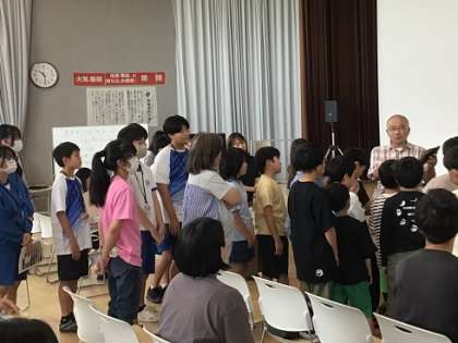本来なら川に入って、生き物の観察等をしますが、前日の雨の影響で残念ながら中止となってしまいました。今日は、交流館の多目的ホールで、逢妻女川や住んでいる生き物について、地域の方の講話を聞きました。