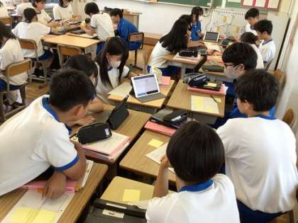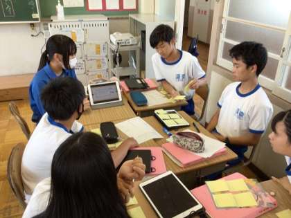 2年生の国語科です。グループでの話し合い活動を通して、魅力的なプレゼンテーションのあり方を考えています。