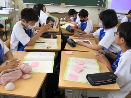 マイクエスチョンとは、「問いカード」と「テーマカード」を使って自由に「問い」をつくるカードゲームです。こうした経験が、総合的な学習の時間などにおいて、自分が探究したい問いを探し、実際に調べ、まとめる活動につながっていきます。写真は1年生の様子です。