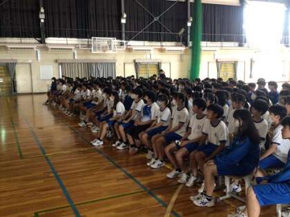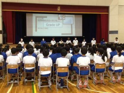 9月に予定している自然教室に向けて、2年生が学年集会を開きました。最初に、今回の自然教室の学年スローガンが発表されました。スローガンは「Grade Up」です。