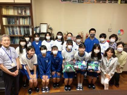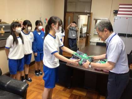 家庭科部の生徒たちが、自分たちで制作した「配膳台カバー」をプレゼントしてくれました。「大切に使ってください」という願いを受け、各学級で役立てていきます。ありがとうございました。