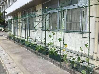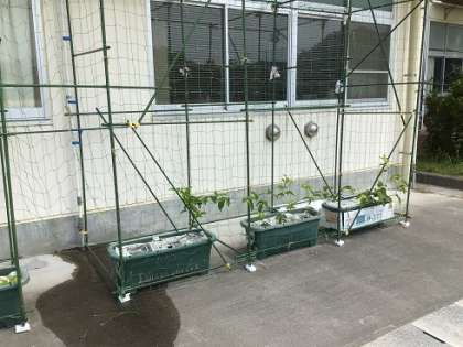 校舎の南側に設置を進めていた「緑のカーテン」がほぼ完成しました。パッションフルーツや冬瓜など、つるがどんどん伸び、実を食べることのできる植物を植えましたので、収穫も楽しみです。ご協力いただいた地域の皆様、誠にありがとうございます。