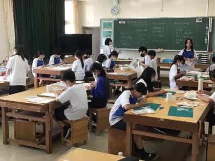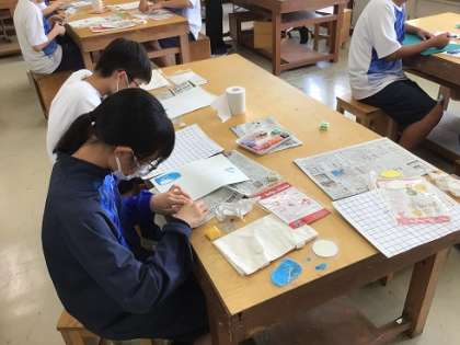 1年生の美術科です。連続模様をスタンプしながらオリジナルのアートバッグを作っていきます。お気に入りの作品に仕上がるとよいですね。