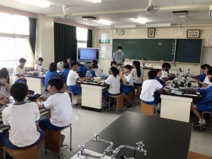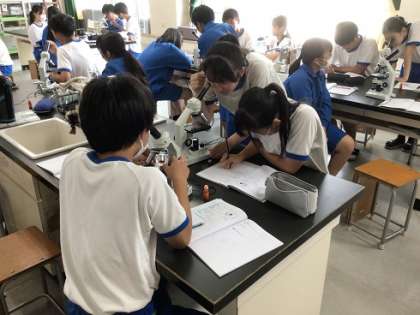 2年生の理科です。顕微鏡を使って、ヒトの細胞を観察しました。うまく見えたかな?