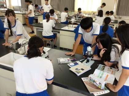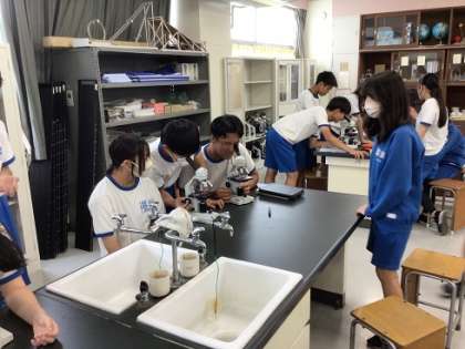 3年生の理科です。こちらも顕微鏡を使って細胞を観察していますが、玉ねぎの根の細胞から細胞分裂の状態を見つけようとしています。