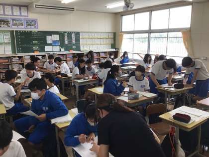 3年生の数学科です。来週予定されている学習診断テストに向けて、過去に出題された問題に挑戦しています。3年生になって、最初の学習診断テストです。しっかりと準備を進めていきましょう。