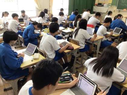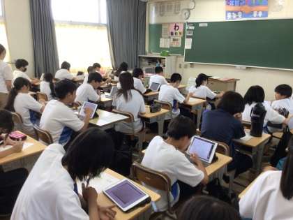 各学級では、合唱の候補曲を聴きました。写真は、学習用タブレットで歌詞を確認しながら曲を聴いている様子です。今後、話し合いを進め、候補曲をしぼっていきます。